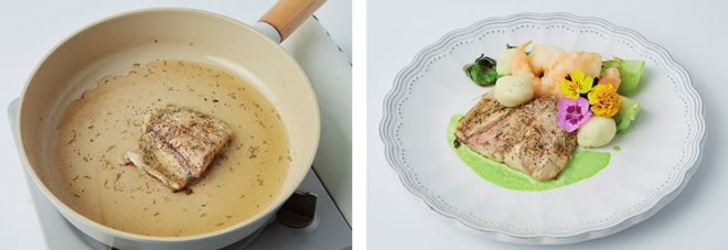 ⑥ 그릇에 깻잎퓌레 → 구운 삼치 → 매시드 포테이토 → 청경채 → 튀긴 새우 → 꽃잎 순으로 올린다.