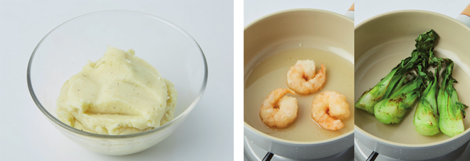 ④ 손질한 새우에 튀김옷을 입혀 180℃로 달군 식용유(180㎖)에 3분간 튀겨 건지고, 마른 팬에 손질한 청경채를 볶은 뒤 토치로 불맛을 낸다.