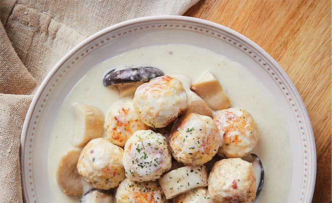 ⑥ 구운 두부새우볼과 버섯, 소금(1g), 후춧가루(1g)를 넣은 뒤 그릇에 담고 파슬리가루(2g)를 뿌린다.