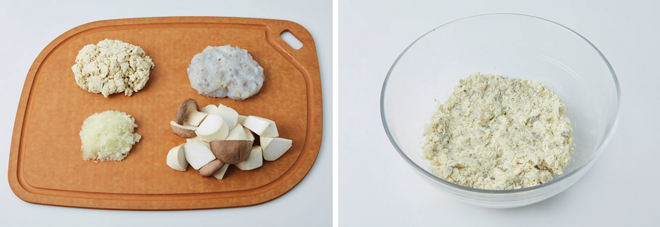 ① 두부는 물기를 제거한 뒤 칼등으로 으깨고, 새우와 양파는 잘게 다지고, 새송이버섯은 한입 크기로 썬다.