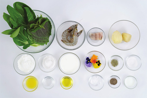 필수 재료 : 깻잎(20장), 청경채(1단), 새우(3마리), 삼치(75g), 생크림(230㎖), 식용 꽃(약간),