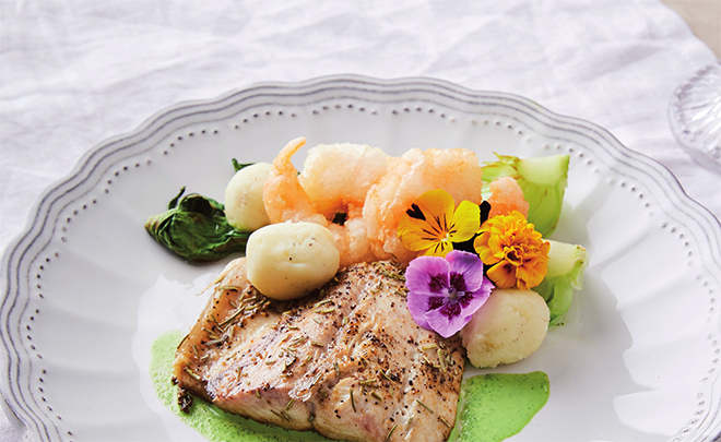 ⑥ 그릇에 깻잎퓌레 → 구운 삼치 → 매시드 포테이토 → 청경채 → 튀긴 새우 → 꽃잎 순으로 올린다.