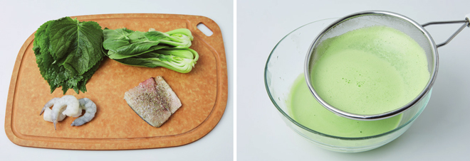 필수 재료 : 깻잎(20장), 청경채(1단), 새우(3마리), 삼치(75g), 생크림(230㎖), 식용 꽃(약간),