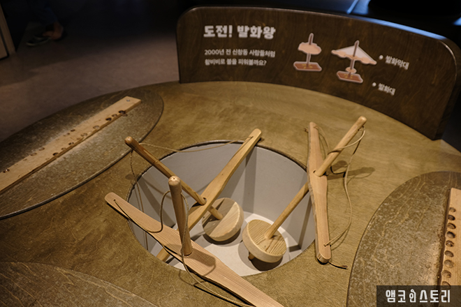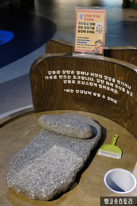 마찰열을 이용하여 불을 지피는 발화대, 다양한 도구들은 농사와 사냥을 위해 쓰였습니다. 당시 농경 생활을 엿볼 수 있는 곡식 창고, 되에 곡식을 담아 갈돌과 갈판으로 곡식을 갈자 쭉정이는 벗겨지고, 하얀 알맹이가 모습을 드러냅니다.