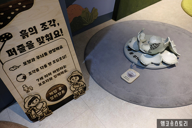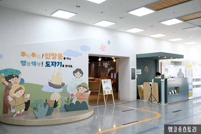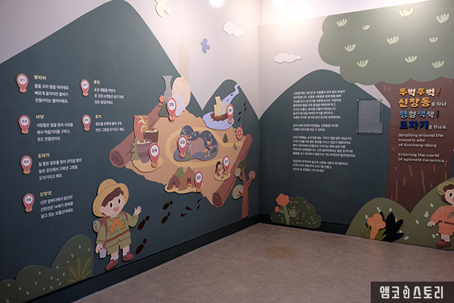 찰칵찰칵! 박물관 친구들이 기다리는 <에필로그> ZONE. 이곳에는 특별히 마련된 포토존이 있군요. 귀여운 캐릭터를 배경으로 인생 컷을 남기는 아이들, 그 뒤로 ‘뚜벅뚜벅 신창동을 지나 형형색색 도자기를 만나요’ 문구가 알록달록합니다.