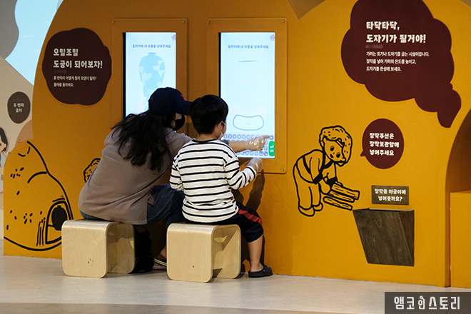 토기의 시대가 저물고 도자기의 시대가 밝았습니다. 선사 시대의 토기에서 조선 시대의 백자까지! 도자기가 변화하는 모습을 한눈에 볼 수 있는 <전이공간>을 지나 <형형색색! 도자기> ZONE에 당도합니다. 역시 다채로운 전시와 재미있는 체험시설로 시선을 사로잡는데요, 먼저 흙을 반죽하고 물레를 돌려 나만의 도자기를 만들어 보는 도자기 만들기 체험! 도자기에 그림을 그리고, 홈을 파서 다른 흙을 넣고, 콩콩 도장을 찍어 무늬를 표현해봅니다. 자, 그럼 이제 장작을 넣어 가마의 온도를 올려 도자기를 구워볼까요?