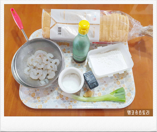 식빵, 냉동 새우, 녹말가루, 대파, 생강, 달걀흰자, 참기름, 식용유, 소금, 후추