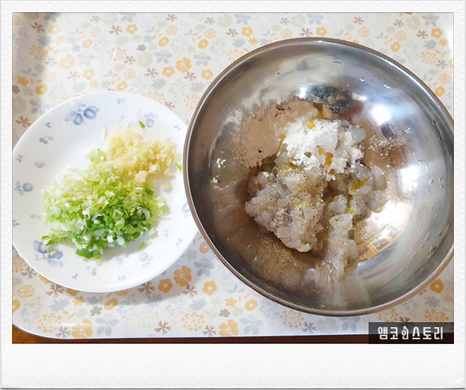 ③ 준비해둔 대파와 생강, 녹말가루 1Ts, 달걀흰자 1Ts, 참기름을 약간 넣은 후 반죽한다.