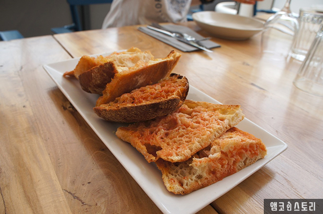 맨 먼저 나왔던 빵. 맛있었다. 그런데 공짜로 제공되는 식전 빵인 줄 알고 덥석 먹었는데 나중에 보니 계산서에 있더라는. 우리 옆 테이블은 맛있다고 하나 더 주문했었다.