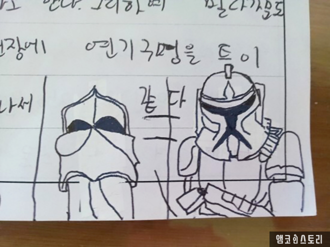 그날 저녁 아드님의 일기장에는 아래와 같이 설명 그림과 글이 있었다. 정말 미술에 소질이 있는 것일까.