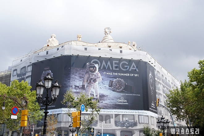 다음 목적지인 까사 밀라에 도착했는데, 가는 날이 장날이라는 말이 스페인에서까지 통할 줄이야! 오메가 협찬으로 보수 공사를 하는지 시계 광고만 크게 걸려있어 건물 전체를 볼 수 없다. 내부 수리 중이라 옥상에 나온 환기구만 보이는데, 모양이 정말 독특하다. 왼쪽에 보이는 환기구가 영화 <스타워즈> 병사들의 모티브가 되었다 한다.