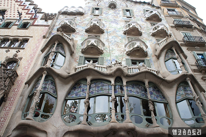 까사는 ‘집’이라는 뜻이고, 바뜨요는 ‘사람 이름’이다. 그 당시 직물업자인 바뜨요의 개인 집을 리모델링한 작품인데, 3년 동안 가우디가 만들었다고 한다. 해골을 연상시키는 테라스와 생선 뼈같이 보이게 하는 독특한 디자인으로 보는 사람의 상상력을 자극하는 걸작이다. 2005년에는 유네스코 세계문화유산에도 등록되었다고 한다.