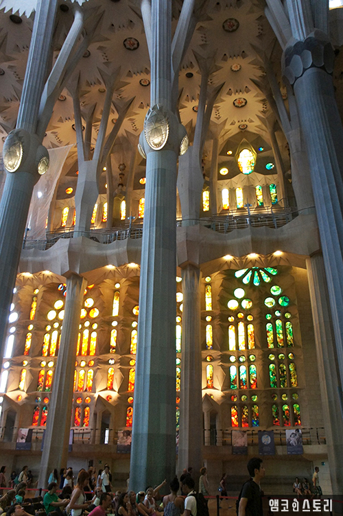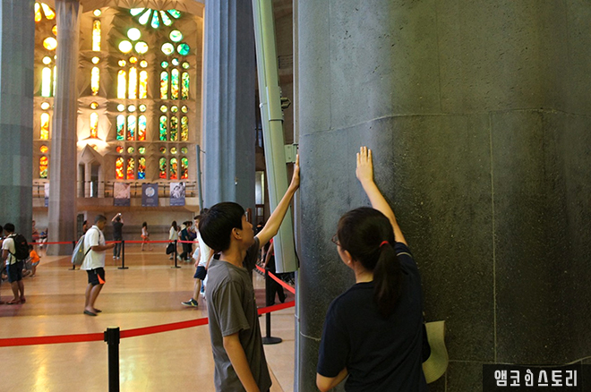 성당을 받치고 있는 튼튼한 기둥들, 가우디의 손길이 분명 닿았을 것 같아 아이들도 기둥을 만져본다.