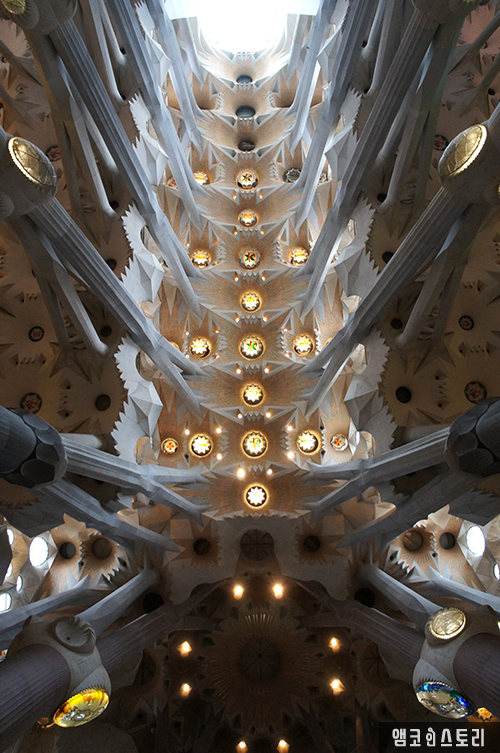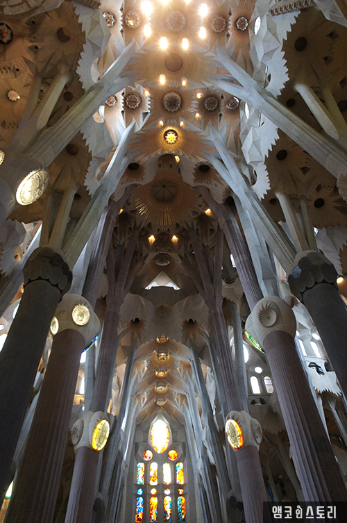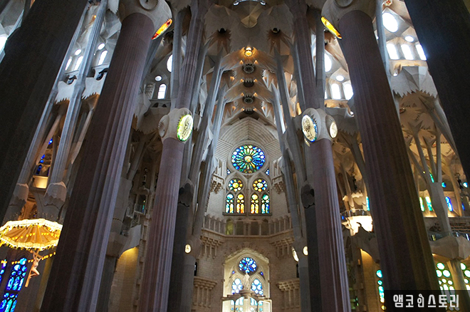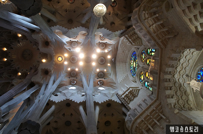 자연 채광을 사용해 저런 아름다운 빛을 성당 내부로 들어오게 하는데, 햇살이 쨍쨍한 날에는 스테인드글라스와 유리창을 통해 들어오는 빛이 더 환상적이라고 한다.