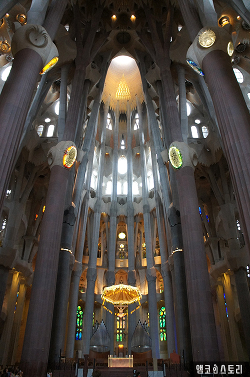 성당을 받치고 있는 튼튼한 기둥들, 가우디의 손길이 분명 닿았을 것 같아 아이들도 기둥을 만져본다.