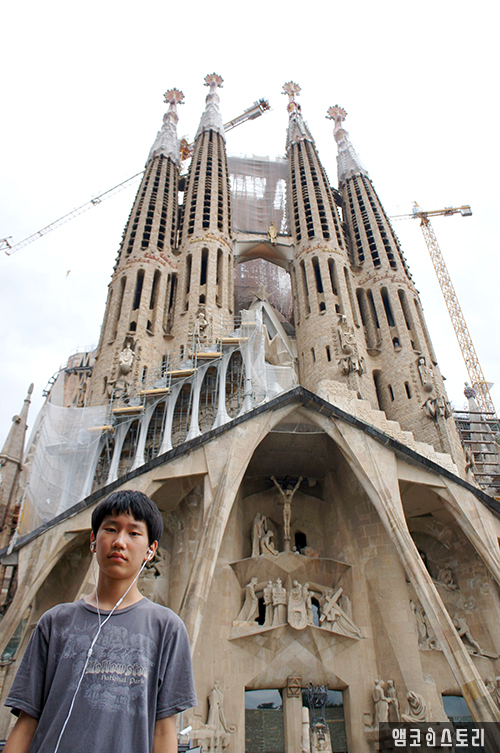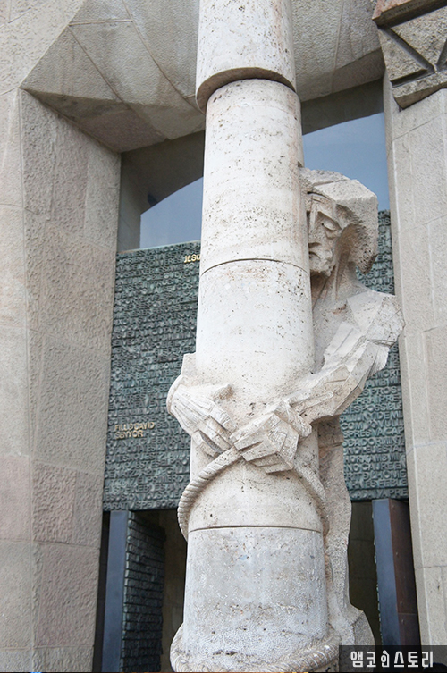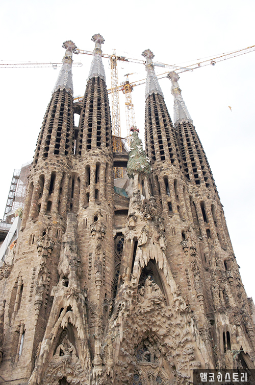 밖으로 나와 성당 주위를 돌며 각 조각상이 갖는 의미, 그리고 가우디의 인생에 대한 자세한 설명을 듣는다. 꼭 옥수수 모양으로 생긴 교회 첨탑과 구멍이 뽕뽕 뚫린 모양이 특이하다. 세상에 이런 건축물이 어디 또 있을까 싶다. 사그라다 파밀리아 앞쪽은 곡선이 특징이라면, 뒤쪽은 직선이 주를 이룬다.