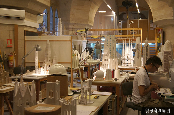 유리창 너머로 현재 공사 중인 사그라다 파밀리아 성당 건축가들의 작업실을 엿볼 수 있도록 해놓았다.