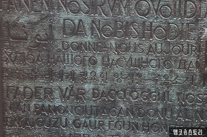 돌기둥 아래에는 세계 각국의 언어로 주기도문을 새겨 놓았다.