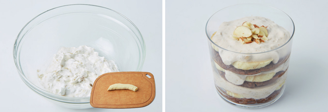 ⑥ 컵에 구운 시트 → 얇게 썬 바나나 → 크림을 반복해 쌓고 아몬드 슬라이스를 올린다.