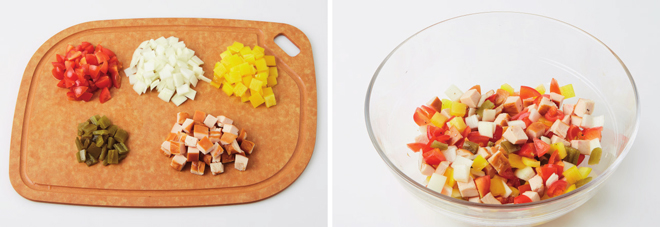 ① 방울토마토, 양파, 파프리카, 할라피뇨, 훈제 닭가슴살은 작게 깍둑 썬다.