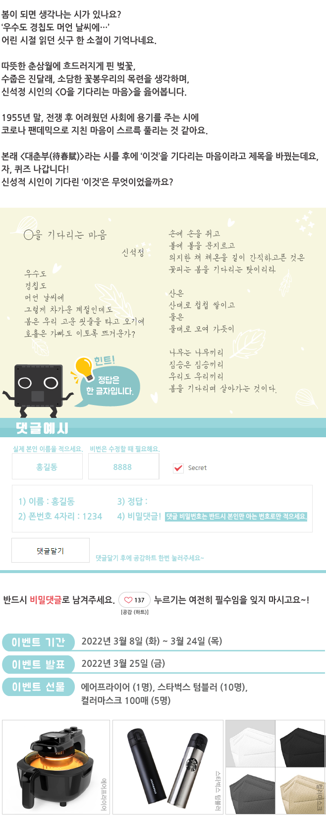 | 봄맞이시(詩) 제목 맞추기 이벤트 결과 발표_웹진 [앰코인스토리] (24) | 2022.03.25 |
