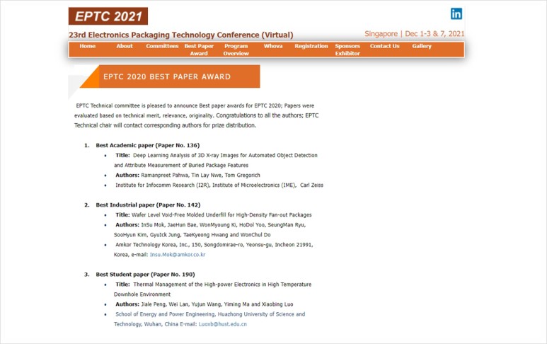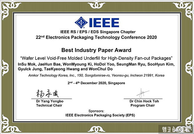 기술연구소 기술개발센터 기술개발팀 목인수 책임이 제23회 EPTC 학회에 제출한 논문 <Wafer level void - free mold>로 ‘Best Paper Award’를 받았습니다.