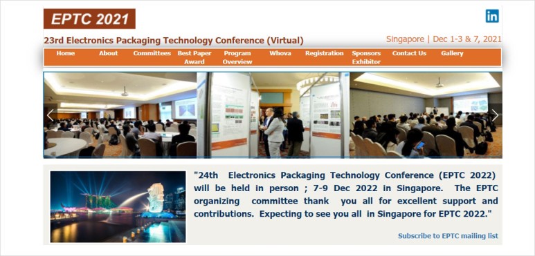 IEEE CPMT(Components, Packaging and Manufacturing Technology Society)이 주관하는 EPTC 학회는 아시아에서 열리는 반도체와 마이크로 시스템 패키징 관련 학회로서는 가장 큰 규모로 이번에 23회를 맞이했습니다. EPTC 2021에서는 keynotes, technical sessions, technology talks, exhibition corners and networking activity 등이 진행되었으며, 디자인부터 제조까지 전자제품 패키징의 전체 스펙트럼에서 기술 발전을 망라할 수 있는 플랫폼을 제공하는 등 기술적 중요사항을 공유하는 자리를 마련하고 있습니다.