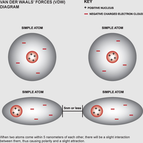 다시 말해, 자유롭게 움직이고 있던 전자들이 우연히 한쪽에 모이게 되면 전하를 가지게 된다는 것인데요, 이 전하는 극성이 없는 다른 무극성 분자를 극성분자로 순간 유도하는 것입니다. 이 힘은 이렇게 우연히 생긴 쌍극자와 유도된 쌍극자 사이에서 발생하기도 하지만, 쌍극자와 쌍극자, 그리고 쌍극자와 유도 쌍극자 사이에서 발생하기도 합니다. 또, 이 힘은 분자 사이의 거리가 아주 가까울 때 중요해지는 힘이지요.