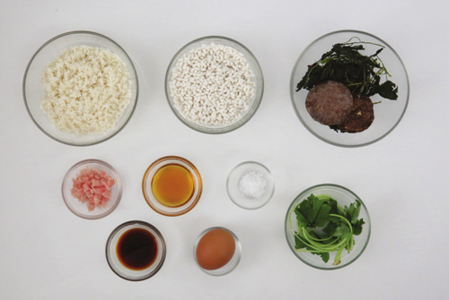 필수 재료 : 건취나물(10g), 건표고버섯(20g), 불린 쌀(80g), 불린 곤약 쌀(60g), 다진 돼지고기(20g), 달걀(1개), 참나물(10g)