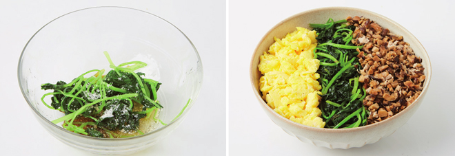 오늘 소개할 요리는 곤약 쌀과 건초나물 불린 물로 지은 밥에 참나물과 다진 돼지고기, 표고버섯을 넣어 먹는 참나물소보로덮밥과, 함초를 넣어 만든 향류를 넣은 밥과 구운 돼지고기에 레몬, 김 가루, 고추냉이, 무순을 얹어 먹는 돼지함초덮밥입니다. 각 요리의 건강비법을 보면, 돼지함초덮밥은 멸치, 함초, 다시마를 갈아 천연 조미료로 간을 맞춰 나트륨의 사용을 줄였습니다.