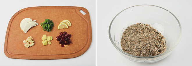 ① 양파는 채 썰고, 쪽파는 송송 썰고, 레몬은 슬라이스하고, 마늘은 으깨고, 생강은 납작 썰고, 건고추는 굵게 부순다. 채 썬 양파와 무순은 찬물에 담가 준비한다.