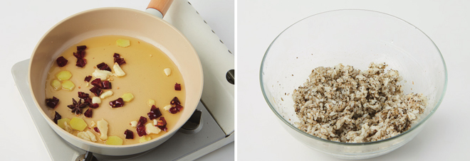 ③ 중간 불로 달군 팬에 식용유(20㎖)와 손질한 향신료를 넣고 3분간 볶아 향유를 만든다. 향유는 10g 정도 덜어 고기 구울 때 사용한다.