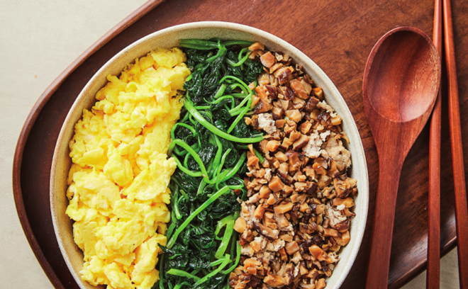 ⑥ 그릇에 취나물 곤약 밥을 담은 뒤 볶은 버섯과 고기, 스크램블드에그, 양념한 참나물을 얹는다.