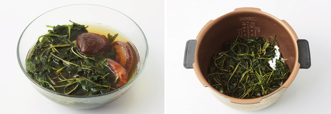 ② 밥솥에 불린 쌀과 곤약 쌀, 불린 건취나물, 물(100㎖)을 넣어 취사 버튼을 눌러 밥을 짓는다.