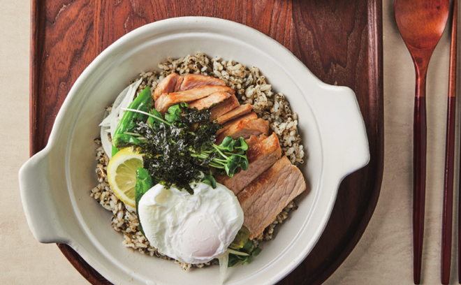 ⑥ 그릇에 비빔밥, 구운 돼지고기와 꽈리고추, 손질한 양파, 쪽파, 레몬, 김 가루, 고추냉이, 무순, 수란을 올린다.