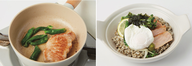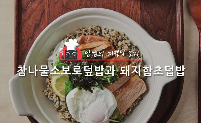 오늘 소개할 요리는 곤약 쌀과 건초나물 불린 물로 지은 밥에 참나물과 다진 돼지고기, 표고버섯을 넣어 먹는 참나물소보로덮밥과, 함초를 넣어 만든 향류를 넣은 밥과 구운 돼지고기에 레몬, 김 가루, 고추냉이, 무순을 얹어 먹는 돼지함초덮밥입니다. 각 요리의 건강비법을 보면, 돼지함초덮밥은 멸치, 함초, 다시마를 갈아 천연 조미료로 간을 맞춰 나트륨의 사용을 줄였습니다.