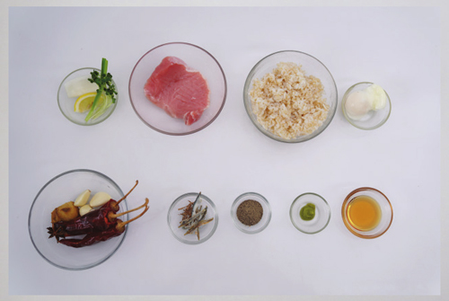 필수 재료 : 양파(10g), 쪽파(3g), 레몬(3g), 무순(20개), 멸치(7~8마리), 건함초(3g), 다시마(5g), 밥(210g), 꽈리고추(5개), 돼지고기(등심, 120g), 수란(1개), 김가루(2g), 고추냉이(2g)