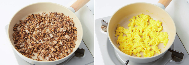 ④ 중간 불로 달군 다른 팬에 식용유(3㎖)를 두른 뒤 달걀을 넣어 스크램블드에그를 만든다.
