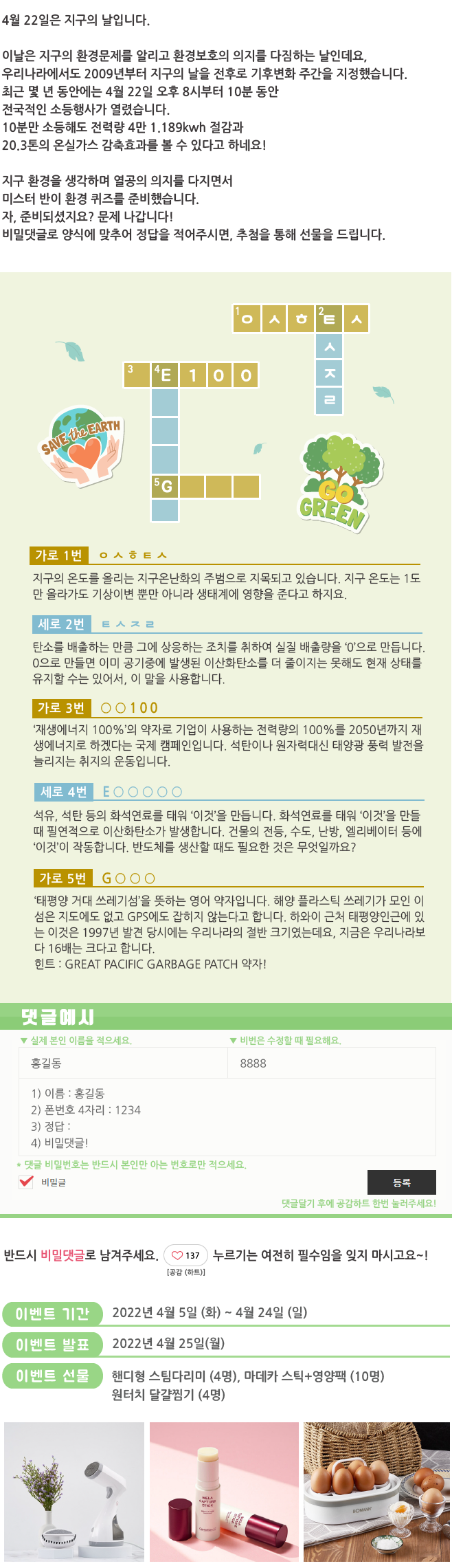 | 지구의 날, 환경을 살리는 가로세로 퀴즈 이벤트 결과 발표 [앰코인스토리] (19) | 2022.04.25 |