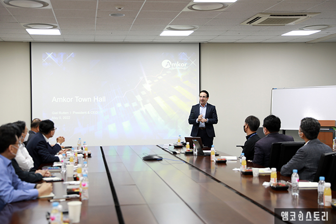 5월 9일, Amkor Technology의 Giel Rutten 사장이 앰코코리아 K5 송도사업장을 방문하였습니다. Giel Rutten 사장은 창업 54주년을 맞이하여 임직원들과의 회의 및 앰코센테니얼홀을 방문하는 등 여러 장소를 둘러보았습니다.