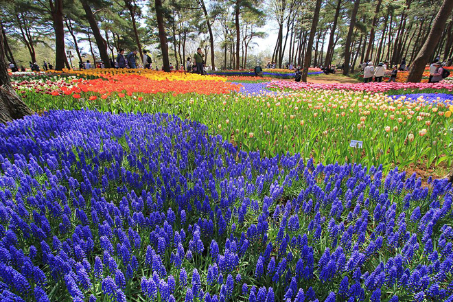 달걀 모양의 오브제나 네덜란드를 연상시키는 풍차나 뜀틀이 띄엄띄엄 있는 숲속의 플라워 가든입니다. 컬러풀한 튤립이 아름답게 핍니다. 매년 다양한 품종을 조합해 디자인을 하고 있어서 몇 번이나 보고 또 보고 싶은 화단을 만들고자 노력한다고 합니다. 4월 중순과 하순에는 26만 송이의 튤립이 다양한 품종으로 가든을 뒤덮습니다. 튤립은 터키 원산으로, 유럽으로 건너가 품종 개량이 활발히 진행되어 에도 시대에 일본에 건너왔습니다. 튤립의 매력은, 다양한 품종을 조합한 색채와 풍부한 디자인이지요. 일찍 피는 품종을 같은 장소에 심어, 시기와 함께 변화하는 화단 등 오랜 지식이나 경험이 가능하게 한 배색이나 심는 방법의 테크닉이 가득 차 있습니다. 나무 그늘 아래 다마고노 모리 플라워 가든에 꽃의 색이나 형태 또한 다양한 튤립이 선명하게 피는 모습은 건강한 에너지가 넘치는 듯 보입니다.