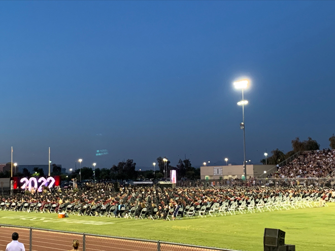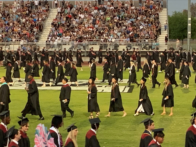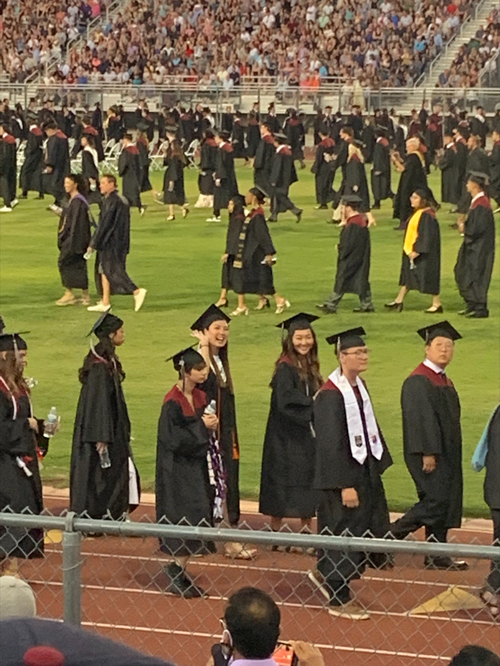 드넓은 풋볼 경기장에 학생들이 앉을 의자가 잔디밭 위에 깔려 있고, 양쪽 스탠드에는 학부모들이 빼곡히 앉아 졸업식을 진행합니다. 해가 지기 시작하니 학생들이 우리나라 대학교에서나 입었던 기억이 나는 졸업복과 학사모를 쓰고 입장을 합니다. 양쪽 스탠드에 있는 가족들을 위해 일렬로 행진을 하면서 손을 흔들어 주는 모습을 보니 갓난아기 때 기저귀 갈아주던 때가 엊그제 같은데 벌써 고등학교를 졸업한다고 하니 가슴이 뭉클해지네요.