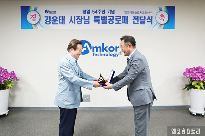 앰코코리아는 지난날 K4 광주사업장의 투자 유치 및 조기 안정화를 적극적으로 지원한 전 광주광역시장 강운태 시장에게 창업 54주년 기념 특별공로상을 전달했습니다. 강운태 전 시장은 앰코를 세계 굴지의 회사로 키어온 앰코코리아 임직원들에게 감사와 축하의 인사를 전했습니다.