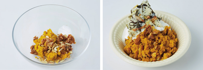 ⑤ 으깬 단호박에 건과일과 볶은 호두, 볶은 아몬드 슬라이스를 넣어 고루 섞는다.