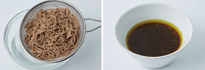 ③ 끓는 물(2컵)에 메밀면을 넣어 5분간 삶아 건진 뒤 찬물에 헹궈 체에 밭쳐 물기를 제거한다.