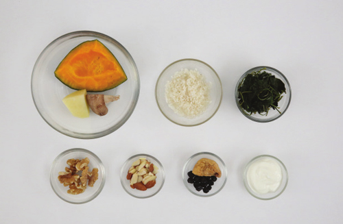 단호박(100g), 감자(5g), 표고버섯(5g), 불린 곤드레나물(10g), 불린 쌀(30g), 건포도(5g), 건무화과(5g), 볶은 호두(5g), 볶은 아몬드 슬라이스(5g), 라즈베리(5g), 요거트(20g)