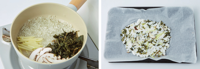 ④ 오븐 팬에 감자곤드레밥을 얇게 편 뒤 180℃로 예열한 오븐에 구워 누룽지를 만든다
