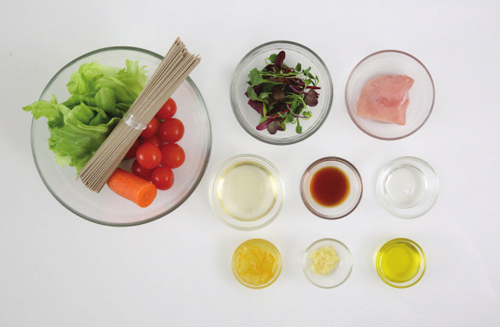 양상추(40g), 당근(10g), 방울토마토(30g), 닭가슴살(60g), 메밀면(90g), 어린잎채소(10g)