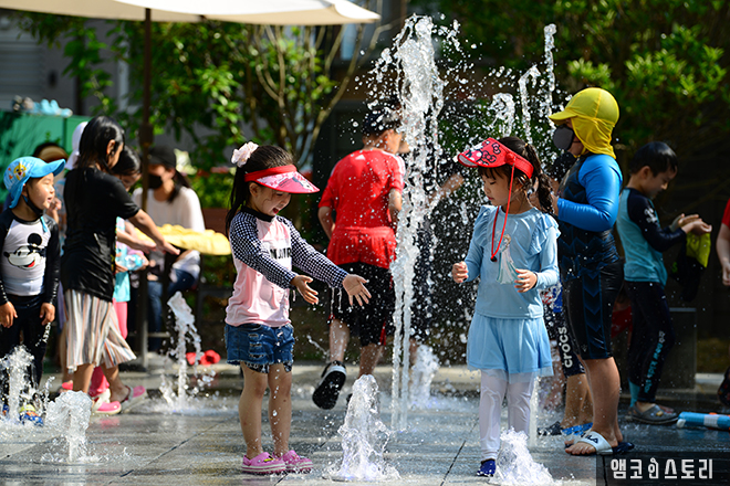 “까르르! 까르르!” 왁자지껄한 소리에 베란다 밖을 내려다보니 요정들이 물놀이를 하고 있었습니다. 코로나19 동안 사회적 거리두기로 인해 중단되었던 바닥 분수가 다시 가동됨에 따라, 아이들이 신난 물놀이를 하며 때이른 무더위를 슬기롭게 피하고 있습니다.