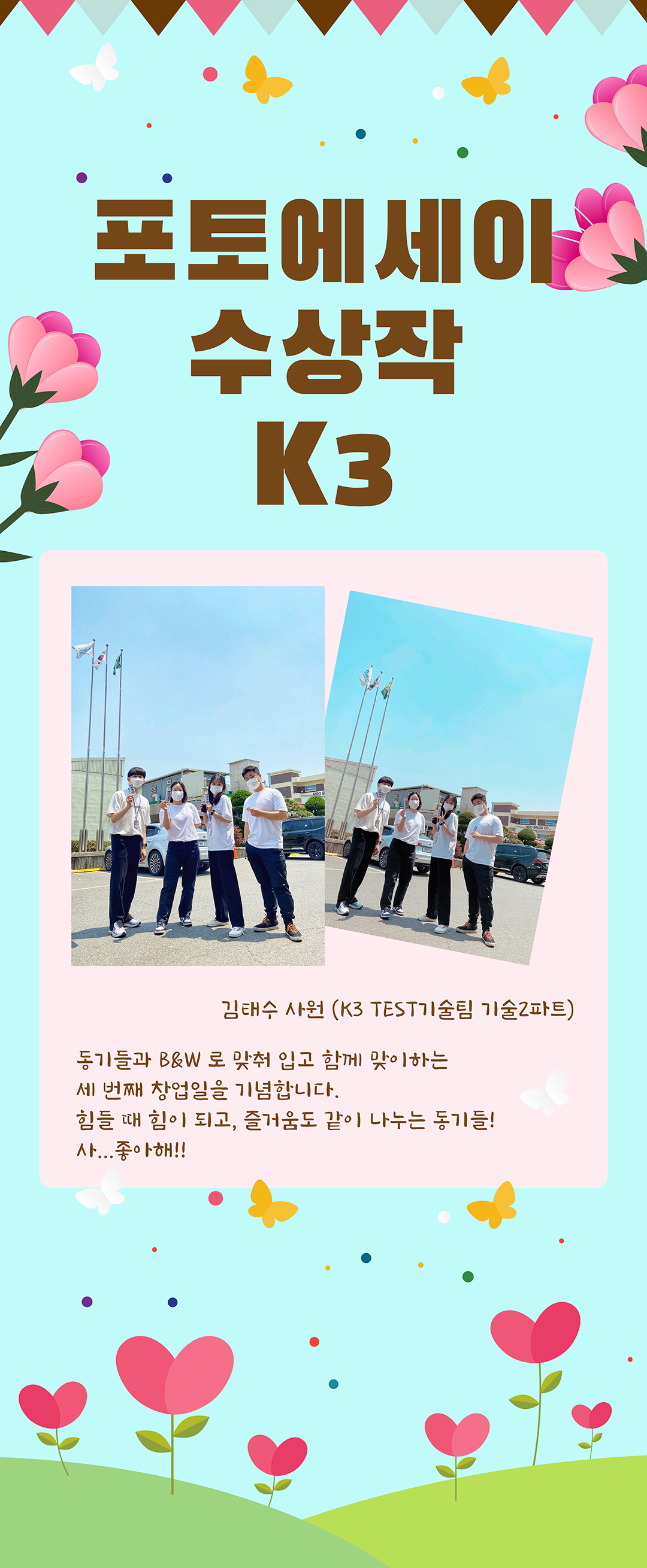 | 창업 54주년 기념 포토에세이 공모전 - K3 기술팀 신입사원즈입니다 (0) | 2022.06.20 |